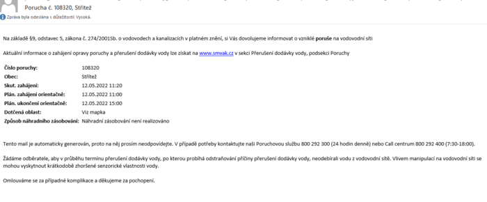 Porucha na vodovodním řadu v oblasti od nádraží směrem na Třinec podél silnice I/68, o dalším průběhu odstranění poruchy budeme informovat